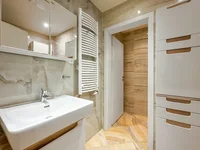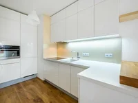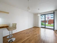 Modern 2+kk apartment with a terrace and a beautiful front garden (80.4m2), a parking space and a large cellar included in the purchase price on the 1st floor of the building in the new construction of the Garden Tower housing project with a reception, security, in an attractive part of Prague — on the border of Vinohrad and Žižkova with easy access to the center of Prague. The high standard of equipment includes high-quality aluminum windows with thermally insulating triple glazing, remote-controlled front window blinds. Underfloor heating, new vinyl floors. Terrace with garden furniture and front garden with maintenance-free grass carpet.