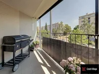 The entrance hall leads to a bedroom (16.68 m2) with bathroom, living room (25.58 m2) with kitchen, toilet and utility room. Both rooms have access to the terrace. The toilet is separated from the bathroom by sliding doors, you can also enter it from the entrance hall. There is also a utility room with a connection valve for the washing machine and dryer. The layout of the apartment offers simple and practical entrances to separate rooms. The apartment is for sale with fully furnished kitchen, built-in closets, dining room, TV, sofa, bed, etc.