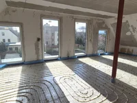 Die Dämmplatten auf der Rohdecke, einschließlich der Heizschläuche der Fußbodenheizung, sind verlegt. Der Estrich fehlt, die Gipskartoninnenwände sind teilweise unverspachtelt.