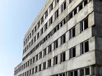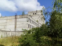 Zweigeschossiges Gebäude steht auf einem umzäunten Bereich. Betonböden, Auf dem Gebiet mehre…