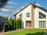 Das zweistöckige Haus wird nach einem individuellen Designprojekt von Gassilikatblöcken gebaut, isoliert, die Fassade ist mit Gips "Korott" und Zierstein "Feudal" dekoriert. Ein solches Haus hat ausgezeichnete Wärmedämmung Eigenschaften und gute Schalldämmung.