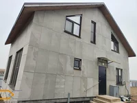 Das Haus wurde auf einer neuen Technologie mit SIP-Panels gebaut. Die Platten bestehen aus zwei orientierten Spanplatten von OSB, zwischen denen eine Schicht aus festem Polystyrolschaum als Heizung unter Druck verklebt wird.