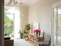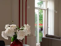 - im Wohnzimmer auf einem ruhigen grünen Innenhof, Baumkronen und der Silhouette des zweiten Turms.