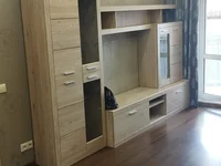 Küche eingebaut, Schweissplatteninduktion, Boden - Fliesen, an der Wand - Kunststein in offensichtlichen Lichtfarben, Küche Schürze - Fliesen, Kühlschrank importiert, Sofa - die in einen Schlafplatz umgewandelt wird.