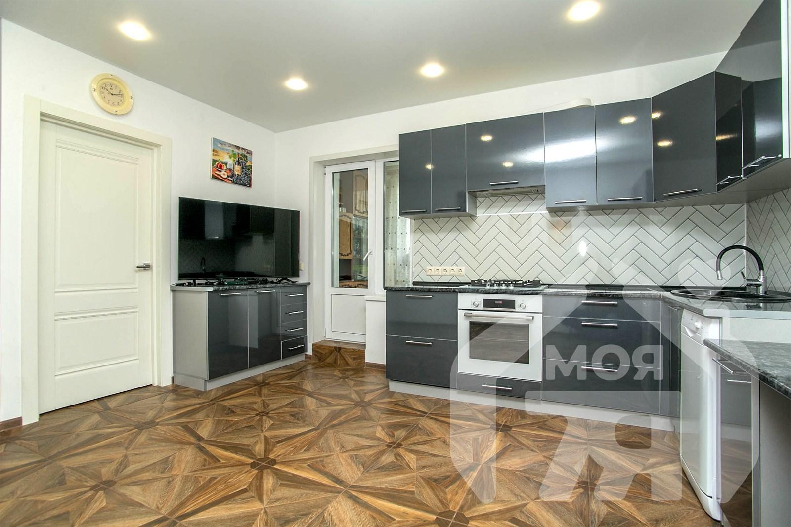 Geräumige, separate Küche mit einer Fläche von 17.9 qm mit einem Balkon, in dem es bequem ist, Küchengeschirr zu speichern, ohne die Küche selbst zu beschneiden und immer seine ordentliche Aussehen. Es gibt bereits eine moderne Küche mit eingebauten Haushaltsgeräten.