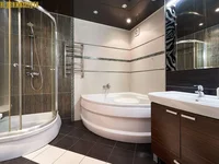 Das Badezimmer ist mit importierten Fliesen ausgestattet. Installierte Eck-Acrylbad, Dusche, Waschbecken mit Tisch mit Abstellplätzen.