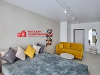 Der restliche Bereich ist mit einem weichen Sofa und einem großen Bett eingerichtet. Der Raum wird durch Designerbeleuchtung und laconic Dekor ergänzt. Panoramafenster bieten eine ausgezeichnete natürliche Beleuchtung und bieten Blick auf die Stadt.
