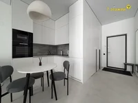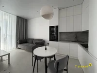 Das moderne Layout umfasst ein Wohnzimmer, einen Arbeitsbereich, einen Ankleideraum und ein abgelegenes Schlafzimmer mit einem schönen Blick aus dem Fenster, wodurch eine einzigartige Atmosphäre. Die Wohnung ist mit allen notwendigen Bosch-Geräten ausgestattet und wird mit Möbeln angeboten, die von MDF bestellt werden. Bemalte Wände, Mikrozementboden. Für Ihren Komfort ist ein Kessel in der Wohnung installiert, die Strecke wird unter Klimaanlage gebracht und eine Satellitenschüssel installiert.