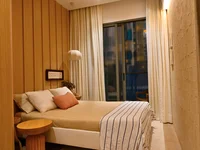 The unit is a large studio offering ample living space incorporating the living room, dining room, workspace, and open kitchen. At the back are the bedroom, a large dressing room and a stylish bathroom.