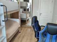 Schlafzimmer mit Etagenbett, Schreibtisch, Klimaanlage, Beleuchtung & Deko