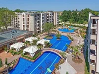 The Cascadas complex in Sunny Beach is a modern, family-friendly residential community featuring several pools, green gardens, playgrounds, and spa areas. It is located in a quiet part of the resort, just about a 10-minute walk from the beach.