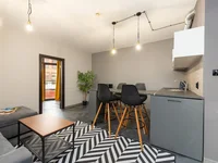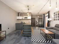 Der großzügige Wohnbereich ist modern eingerichtet und ausgestattet mit Couch, Stehlampe, Couchtisch und Regalen. Die integrierte Küche verfügt über einen Tresen mit passenden Barstühlen, ein Kochfeld, Spülbecken sowie einen Kühlschrank. Vom Wohnbereich aus besteht ein direkter Zugang zum Balkon.