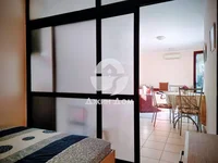 Sie besteht aus einem geräumigen Wohnzimmer mit Kochnische und einem abgetrennten Schlafzimmer, einem Badezimmer mit WC und Duschkabine sowie einer Terrasse mit teilweisem Meerblick.