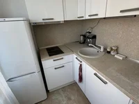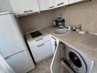 Küchenzeile mit Kühlschrank, Cerankochfeld, Waschmaschine und Spüle