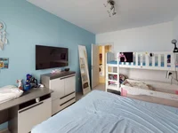 Das Schlafzimmer ist ruhig gelegen und bietet ausreichend Platz für ein großes Bett sowie Stauraummöglichkeiten. Es eignet sich ideal für Erholung und Entspannung.