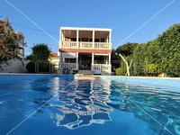 FOR SALE, HOUSE, SUKOŠAN, A beautiful house of 185 m2 NKP is for sale, with a swimming pool 12m x 4.2m with a large sun deck and a landscaped garden of 496m2.The house itself has 2 floors and is designed as 2 separate residential units. On the first floor there is an entrance hall, a spacious living room and a kitchen with access to a large terrace. There are 2 more bedrooms, one toilet and one bathroom. Internal stairs lead to the second floor, where there is a spacious living room and dining room with access to a large covered balcony with a beautiful view of the Adriatic Sea. The upper floor also contains 2 bedrooms, a separate toilet and a bathroom.All interior spaces are air-conditioned, furnished and equipped.The villa was built in Dalmatian style, almost entirely by hand, with Brac stone, which means high-quality construction and top-notch insulation.The yard is surrounded by a traditional stone wall recognizable in Dalmatia.
