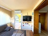 The apartment on the first floor of this house is equipped with two rooms, one of which has direct access to a spacious terrace that offers a view of the nearby sea. The living room also has access to the same spacious terrace. In addition to the above, the apartment also has a bathroom and a kitchen with a dining room.