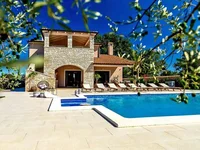 Im Erdgeschoss befinden sich neben einer kleineren Lobby ein Wohnzimmer, ein Esszimmer und eine modern ausgestattete Küche mit eigenem Vorratsraum in einem größeren „Open Space“-Bereich, der ganztägig von Tageslicht durchflutet wird Durch eine große Glaswand gelangt man auf eine überdachte Terrasse mit Sommerküche und Blick auf den umzäunten und gepflegten Garten. Das Wohnzimmer mit großem Kamin ist wie der Rest der Villa nach einem hohen Standard und einem modernen Ansatz eingerichtet, so dass der Raum attraktiv für das Auge, aber auch funktional und nutzbar ist. Alle modernen und derzeit bekanntesten Innendekorationstechniken wurden verwendet. Im Erdgeschoss befinden sich neben dem Salonbereich auch eine Gästetoilette, sowie zwei Schlafzimmer, die jeweils über ein eigenes Badezimmer verfügen. Es ist wichtig anzumerken, dass jedes Zimmer und Badezimmer auf seine eigene Weise personalisiert ist und das "Copy-Paste"-Prinzip bei der Dekoration nicht verwendet wurde. Im Erdgeschoss gibt es auch eine Taverne/Konoba für den Gästeempfang. Eine Innentreppe führt in die obere Etage.