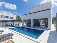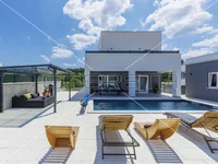 Istria, surroundings – a detached villa of a modern design is for sale in a quiet part of the village, in complete peace, only 3.5 km from the center of the historic town of Vodnjan, which has almost all essential facilities for life.The villa was built in 2022, and is characterized by quality construction and carefully selected materials, as well as a beautiful interior design.The net area of the house is 202 m2, while the land on which it is located is 601 m2.The layout consists of: hallway, living room with kitchen and dining room and access to the terrace, toilet, storage room and bedroom with bathroom on the ground floor of the building.There are two bedrooms on the first floor, each with its own bathroom, TV, air conditioning and access to the terrace.House heating – underfloor (heat pump) installed throughout the house + air conditioners.The villa is fully furnished and equipped and is being sold as such.The yard is completely fenced and decorated, the swimming pool of 32 m2 with heating offers comfort and a longer rental season.Next to the house there is an auxiliary building with a spa area – sauna, hydromassage tub and shower.