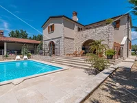 Istria, in one of the settlements of the Municipality of Svetvinčenat, in complete peace, surrounded by nature, this impressive villa built in a rustic style is located.The villa is located on a spacious plot of 1527 m2, surrounded by a stone wall and a fully landscaped garden with Mediterranean plants and olive trees, radiating real charm.Built in combination with real stone, quality workmanship, and paying attention to every detail in the exterior and interior decoration.The net area of the house is 226 m2, and it extends over two floors.On the ground floor there is an entrance area, a living room with a beautiful authentic fireplace and an exit to the terrace, a kitchen with a dining room, a bedroom with a bathroom and an additional toilet.The staircase leads to the first floor where there are three bedrooms, each with its own bathroom. Two rooms are spacious and have access to the balcony from which you can go down the stairs directly to the garden.Each room has air conditioning.Ceramic floors throughout the house.In the outer part of the house there is a spacious covered terrace with a summer kitchen and a fireplace, as well as a storage room and an additional outdoor toilet.The pool area is 36 m2, and the sun deck is lined with real stone cladding.In the garden there is also a children’s playground, an outdoor shower.The yard is beautifully decorated, with lots of greenery and a spacious lawn.Parking spaces for several cars are inside the yard.The villa is an ideal property for a vacation away from the noise and bustle of the city.The current owners deal with tourist rentals and have a very good occupancy rate.