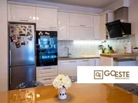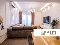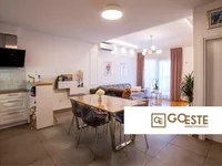 Im ersten Stock der Wohnung befindet sich ein Wohnzimmer, Esszimmer und Küche. Diese Etage ist geräumig und voller Tageslicht dank großer Glasflächen, die zu einer Loggia von 27 m2 führen, die ideal für die Erholung im Freien ist, Zeit mit Familie und Freunden verbringen und einen Blick auf die Gegend genießen. Im ersten Stock gibt es auch ein modernes Bad.