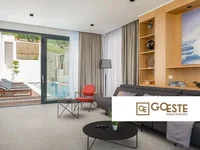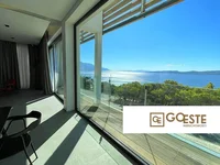Im zweiten Stock befindet sich eine geräumige und gut ausgestattete Küche mit Esszimmer, die mit hochwertigen Materialien und Geräten gebaut wurde. Die Küche und das Esszimmer verfügen über eine Glas-Südseite, die Zimmer mit zusätzlichem Licht und einen schönen Blick auf das Meer bietet. Das Wohnzimmer auf der Nordseite hat einen direkten Ausgang zur Terrasse, wo es einen beheizten Pool mit einem Liegebereich gibt. Auf dieser Etage gibt es auch drei luxuriöse Schlafzimmer mit eigenem Bad und einen Innenhof.
