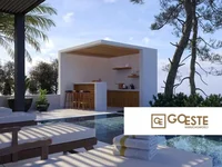 Das Apartment S1 mit einer Gesamtfläche von 120 m2 befindet sich im Erdgeschoss und im 1. Stock. Im Erdgeschoss befindet sich eine Toilette, Küche mit Esszimmer und Wohnzimmer mit Ausgang zur überdachten Terrasse mit Pool. Im 1. Stock befinden sich drei Schlafzimmer und zwei Badezimmer.