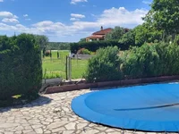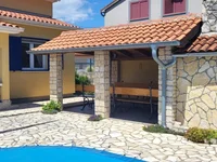 Pool, überdachte Terrasse, eigenes Grillhaus / BBQ-Haus mit grosser Terrasse, eigener Lagerhütte für Gartenmöbel im privaten Bereich – mit Blick auf die Olivenplantagen am Nachbargrundstück, das Agrarland ist. Vor dem Haus ein grosses Einfahrtstor und Parkone für bis zu 4 Autos. Vom Einfahrsbereich bis zum Garten – alles in schönen istrischen Steinen gepflastert!