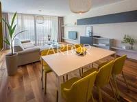 Die Wohnung ist mit modernen Möbeln und Ausstattungen höchster Qualität ausgestattet, wie beispielsweise Schuco-Aluminium-Tischlerei mit Dreifachglas, raumhohen Innentüren mit verdeckten Scharnieren, Miele-Küchengeräten sowie einbruch- und feuerhemmenden Eingangstüren.