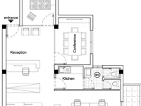 Modernes Büro im ersten Stock, komplett renoviert im Jahr 2018 mit einem minimalen, sauberen Design. Zu den Merkmalen gehören erhöhte Bodenbeläge, Glaspartitionen, doppelt verglaste Fenster, volle A/C, CYTA-Faseranschluss, Master-Lichtschalter, beleuchtete Zeichen, versteckte Miniküche und brandneue elektrische & Sanitäranlagen.