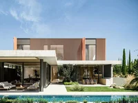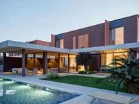 Der obere Teil der Villa ist in vertikale Lamellen eingewickelt, die Schutz vor der Sonne bieten. Für zusätzliche Privatsphäre wird das Hauptschlafzimmer über eine Brücke von den anderen Schlafzimmern getrennt. Die übergroßen Fenster bieten einen schönen Blick auf den Garten und den Poolbereich.