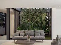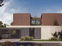 Der obere Teil der Villa ist in vertikale Lamellen eingewickelt, die Schutz vor der Sonne bieten. Für zusätzliche Privatsphäre wird das Hauptschlafzimmer über eine Brücke von den anderen Schlafzimmern getrennt. Die übergroßen Fenster bieten einen schönen Blick auf den Garten und den Poolbereich.