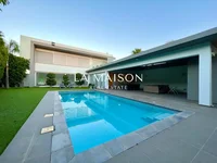 The property is incredibly functional and thoughtfully designed by the owners to ensure every nook serves a purpose. The house forms with extensive openings that provide stunning views of the beautiful swimming pool and garden. The neighborhood is pleasant and well-maintained, with the plot adjoining a pedestrian pathway, enhancing privacy and natural light.