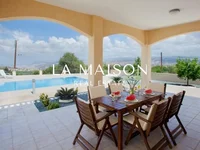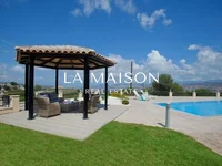 This Luxury villa is situated on the outskirts of Stroumbi Village, and offers the utmost in country living. It sits on a plot of 1,350 m2 with Private Swimming Pool, Beautifully maintained Lawns, Tiled Patios and Landscaped Mature Gardens which provide total comfort, beauty, privacy and offering plenty of space for entertaining. Upon entering the property is the spacious living area which is an open plan to the fully equipped Kitchen. The Wood Burning Fireplace with stone cladding surrounds makes this area nice and cosy giving off plenty of heat in the cooler winter months. The french doors from the living area lead out to the covered veranda offering a beautiful seating area with endless Mountain Views. Also on the ground floor there is one double bedroom with fitted wardrobes and an ensuit shower room. On the first floor there are three double bedrooms, all with en-suite bathrooms and fitted wardrobes. Next door to one bedroom there is a fully equipped utility room. The main bedroom has an easy access to the large balcony offering simply stunning unobstructed mountains views.