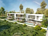 Three modern, spacious luxury residences offer a fresh, contemporary style that extends to the exterior gardens and private pools. Constructed with the highest quality materials and designed for energy efficiency, these homes feature underfloor heating, air conditioning, and an energy performance category A rating. Each villa spans two floors, opening onto a beautiful terrace that leads to a tranquil swimming pool and garden. Additional amenities include a spacious private garden, a garage for two cars, and customizability to meet individual needs. The interiors boast marble flooring or semi-solid parquet in living and dining areas and semi-solid parquet in bedrooms, all set within the serene, green surroundings.