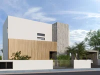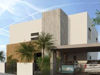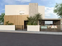 This contemporary designed house features a beautiful garden with an optional pool, double garage, and terraces. The ground floor includes a spacious living room, dining room, modern kitchen, and family sitting area, all with garden views, plus a guest WC. The first floor comprises four bedrooms: a master bedroom with en-suite bathroom and walk-in wardrobe, and three additional bedrooms sharing a common bathroom.