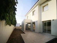 This modern house features a beautiful garden, a double covered garage, and a covered terrace. The ground floor includes a spacious living room, dining room, and a separate modern kitchen, all with views of the terrace and garden. There is also a guest WC and an en suite room with a separate entrance on this level. The first floor houses four bedrooms: a master bedroom with an en-suite bathroom, and three additional bedrooms sharing a common bathroom.