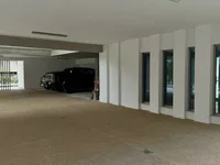 Ein Salzwasser-Pool mit einem Wasserfall-Feature, eine körperliche Bewegung im Freien und Yoga-Bereich und angelegte Gärten auf Grundebene.
