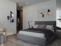 Schlafzimmer und Wohnbereich mit hochwertigem schwimmendem Parkett oder großen Fliesen