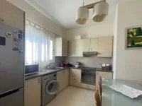 Das Apartment ist halb möbliert mit weißen Gütern in der Küche.