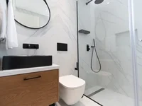 Bathrooms featuring walk-in showers and wall-mounted toilets