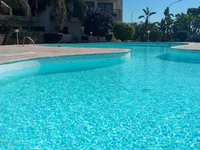 The apartment features an open-plan layout with a bright living area, a fully equipped kitchen, a spacious bedroom, and a private veranda perfect for outdoor relaxation. Residents enjoy access to a communal swimming pool, a fully equipped gym, and landscaped gardens, ensuring a resort-style living experience.