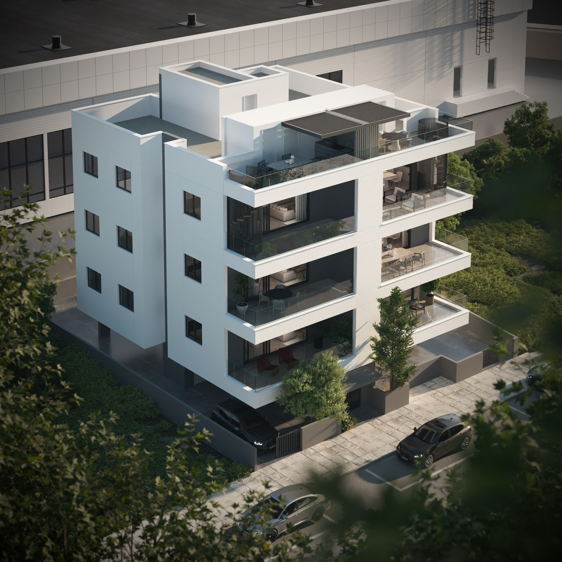 Das Apartment verfügt über komfortable Wohnbereiche, drei gut proportionierte Schlafzimmer und profitiert von überdachten Parkplätzen und einem privaten Abstellraum. Ausgestattet mit Photovoltaik-Panels bietet es reduzierte Energiekosten und umweltfreundliches Wohnen.