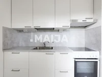 The kitchen is equipped with a ceramic hob, a fridge-freezer and practical cabinets, and windows overlook the courtyard and the surrounding neighborhood. District heating ensures pleasant living comfort all year round.