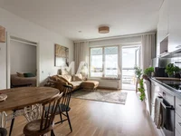 The squares of the apartment have been used efficiently. Storage space is well found thanks to a separate walk-in closet and fixed storage furniture. In addition, the housing company has caged storage facilities and a storage room for outdoor recreation equipment.