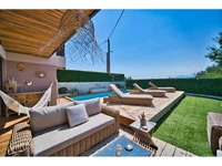 ASPROMONT/GAIRAUT Superb ultra contemporary semi-detached villa of 150 m² built in 2021 with very refined quality services. An environment of absolute calm, decoration in bohemian style. Large living room with an American kitchen 75 M2 with fireplace, all rooms give access to the terraces and the south-facing swimming pool. Upstairs, 3 bedrooms with exteriors, 2 bathrooms, dressing rooms, cupboards. Full-storey cellar, a garage and 2 parking spaces. 15 minutes from Nice city center!