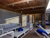 There are two main suites, one in the main house outside the living area and one in a separate pool pavilion. The downstairs guest bedroom also has an en-suite bathroom.