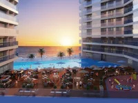 Twin Residence is a premium-class multifunctional residential complex located on the first line of the coastline, 100 meters from the sea. The residential complex has a fitness center, spa, indoor and outdoor pools, a beauty salon, a café, a playground, a games room, outdoor and underground parking (250 cars), a car wash, a reception, and a private beach. Complete set of the apartment — white walls. View from the window — the sea.