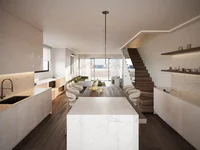 Der Hauptwohnbereich verfügt über ein offenes Wohnzimmer und eine Küche mit Corian Arbeitsplatten, integrierte Umgebungsbeleuchtung und benutzerdefinierte Kleiderschränke mit versteckten LED-Streifen. Das Wohnzimmer wird durch einen elektrischen Kamin und große energieeffiziente Fenster von Alumil erweitert und bietet reichlich natürliches Licht und direkten Zugang zum Balkon. Hier finden Sie den privaten beheizten Pool mit Gegenstrom-Schwimm- und unverbauten Meerblick sowie einen Grillplatz und Gäste-WC .