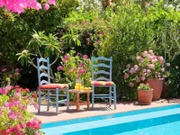 Ein privater Pool mit einem Kinderbereich befindet sich in der Mitte des Gartens, der mit Orangen-, Zitrone- und Aprikosenbäumen gefüllt ist, zusammen mit schattierten Plätzen für das Essen im Freien. Die Unterkunft ist komplett eingezäunt und verfügt über Privatparkplätze.